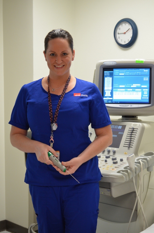 Jennifer Thomas, UTMB mammographer, shows the core tissue extraction needle used for minimally invasive breast biopsies.