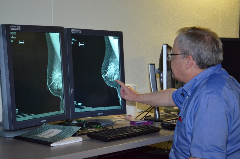 UTMB Director of Breast Imaging Dr. Morton Leonard points to a suspicious mass in a breast mammogram image.